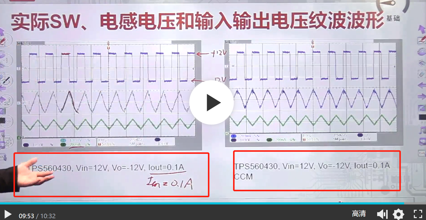 1. 电感的输出电流平均值为200μH一格,当输出电流为0.1安培,假设效率为100%或较高,电感电流Iin也约为0.1安培。 2. 根据电感电流的平均值计算公式,电感电流的平均值等于I加IO,因此此时电感电流的平均值为0.2安培。 3. 这一结果符合之前对电感电流平均值的推导。 4. 讨论的内容是负压型输出升降压变换器的工作原理及其输入输出关系。