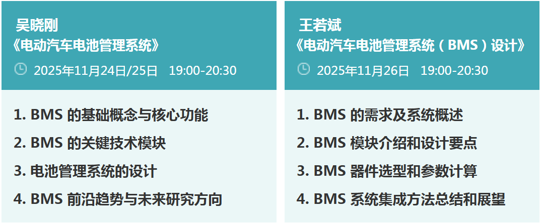 电源工程师培训授证项目致力于做专业的电源技术培训,全年4期直播覆盖DC-DC转换器、MOS/IGBT驱动技术、功率因数校正(PFC)、电池管理。本期是第四期详解电动汽车中的电池管理。